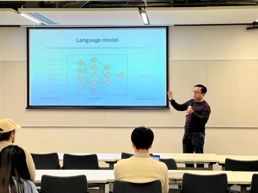 The session began with a presentation by Dr Nguyen, who provided an accessible introduction to AI and large language models for a non-technical audience. He explained how such models generate outputs by predicting the next word in a sequence based on probabilities learned during training. He outlined three key stages in the development of modern AI systems: